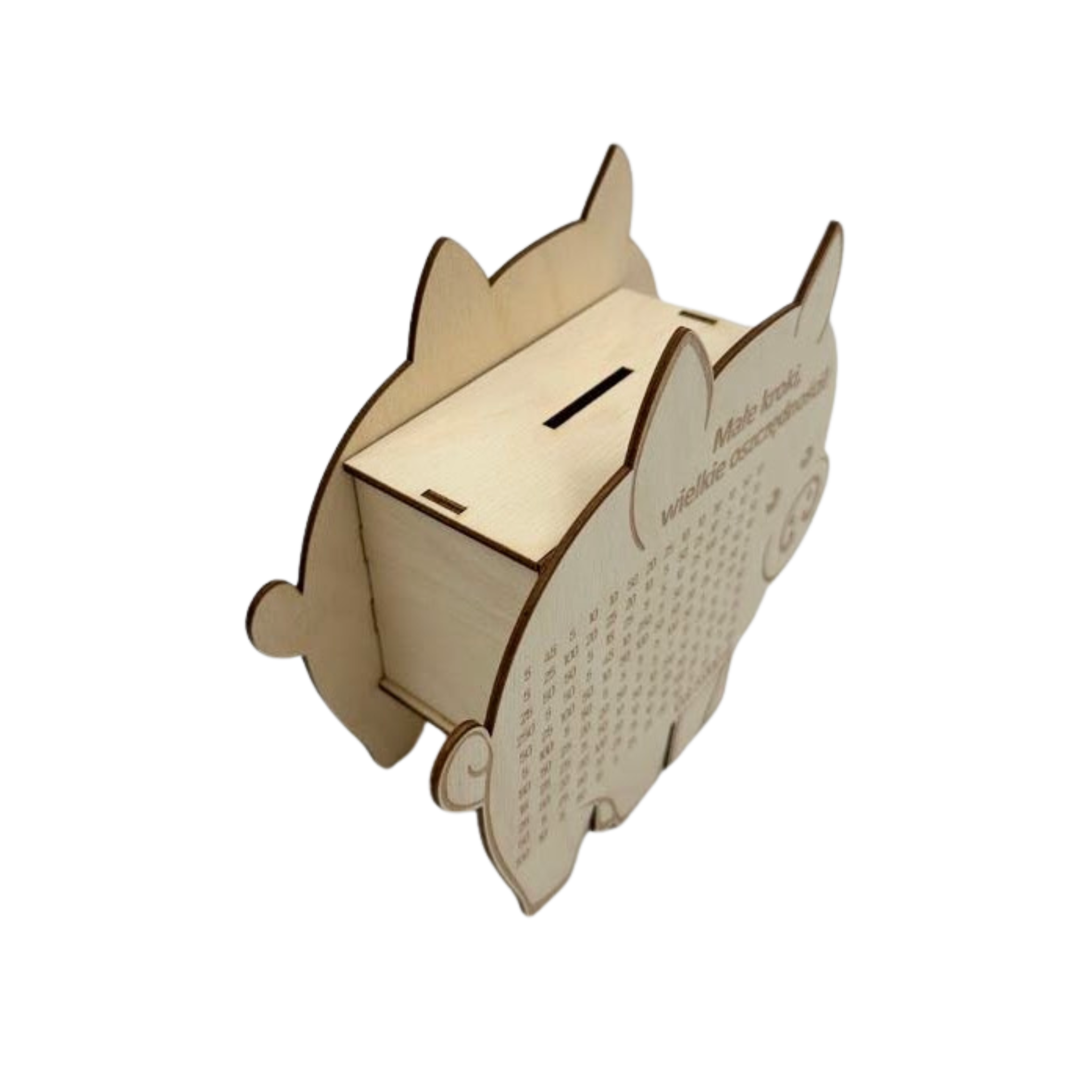 - Wygrawerowana tabelka: Na powierzchni skarbonki znajduje się tabelka, w której można wykreślać kolejne kwoty w miarę dodawania gotówki.