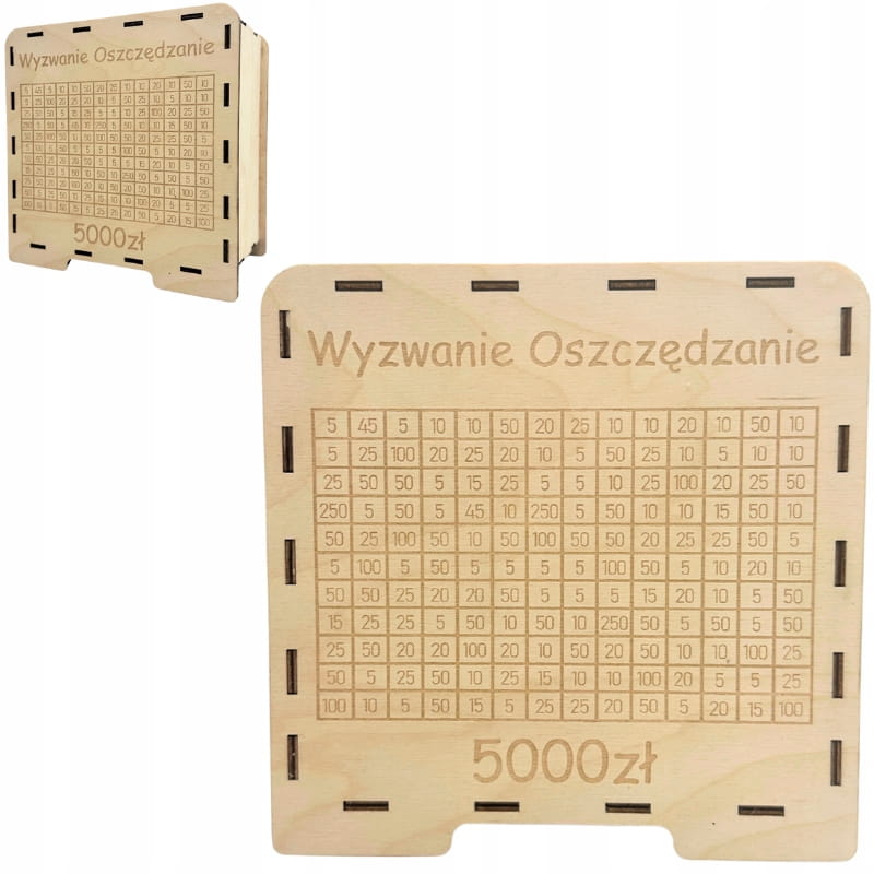 Drewniana skarbonka wykreślanka WYZWANIE OSZCZĘDZANIE drewno