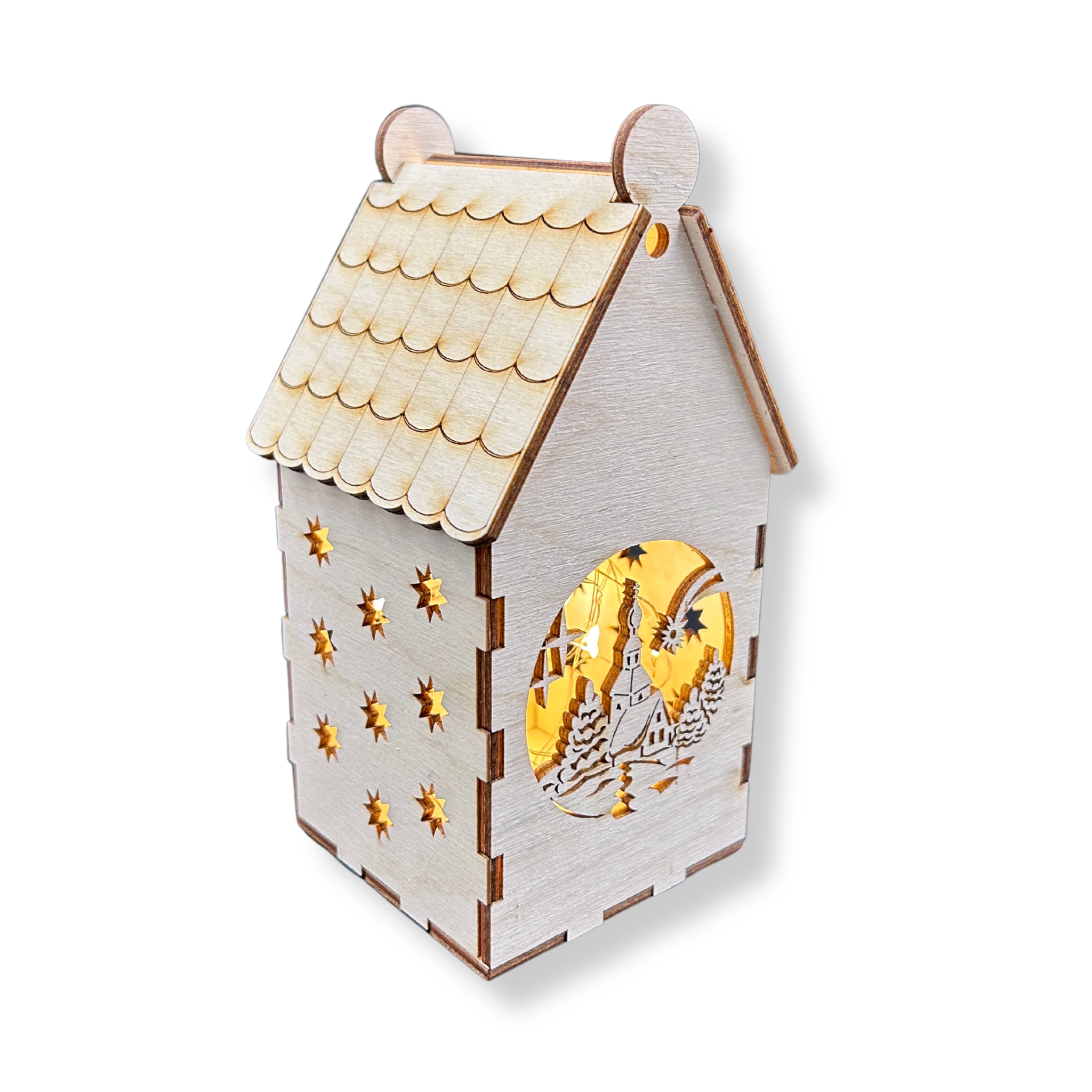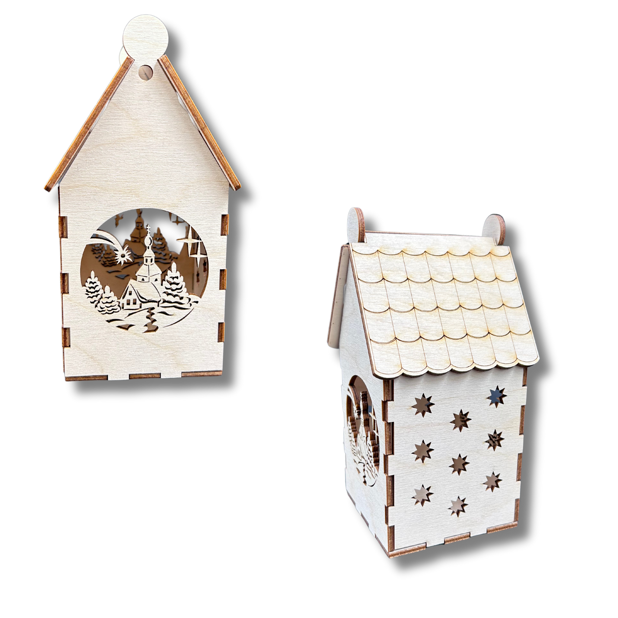 Drewniany domek lampion Zimowe Miasto gwiazdki latarenka ze sklejki 3D ozdoba decoupage dekor święta Boże Narodzenie