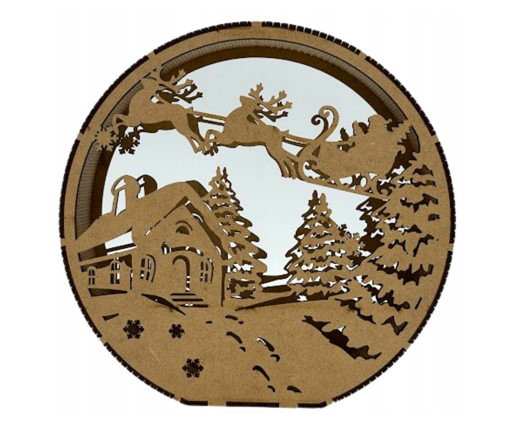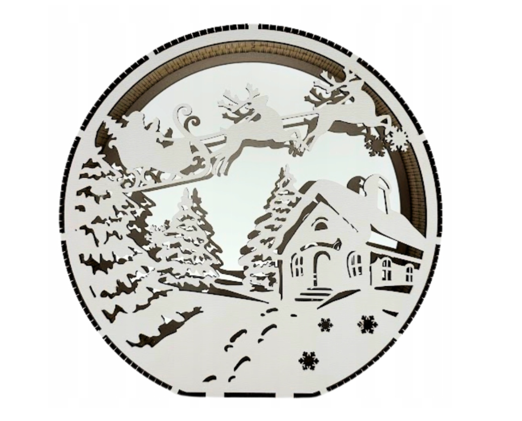 Lampion z wizerunkiem Świętego Mikołaja mknącego na saniach nad ośnieżonym domkiem. Jest to tradycyjny obrazek Świąt Bożego Narodzenia.