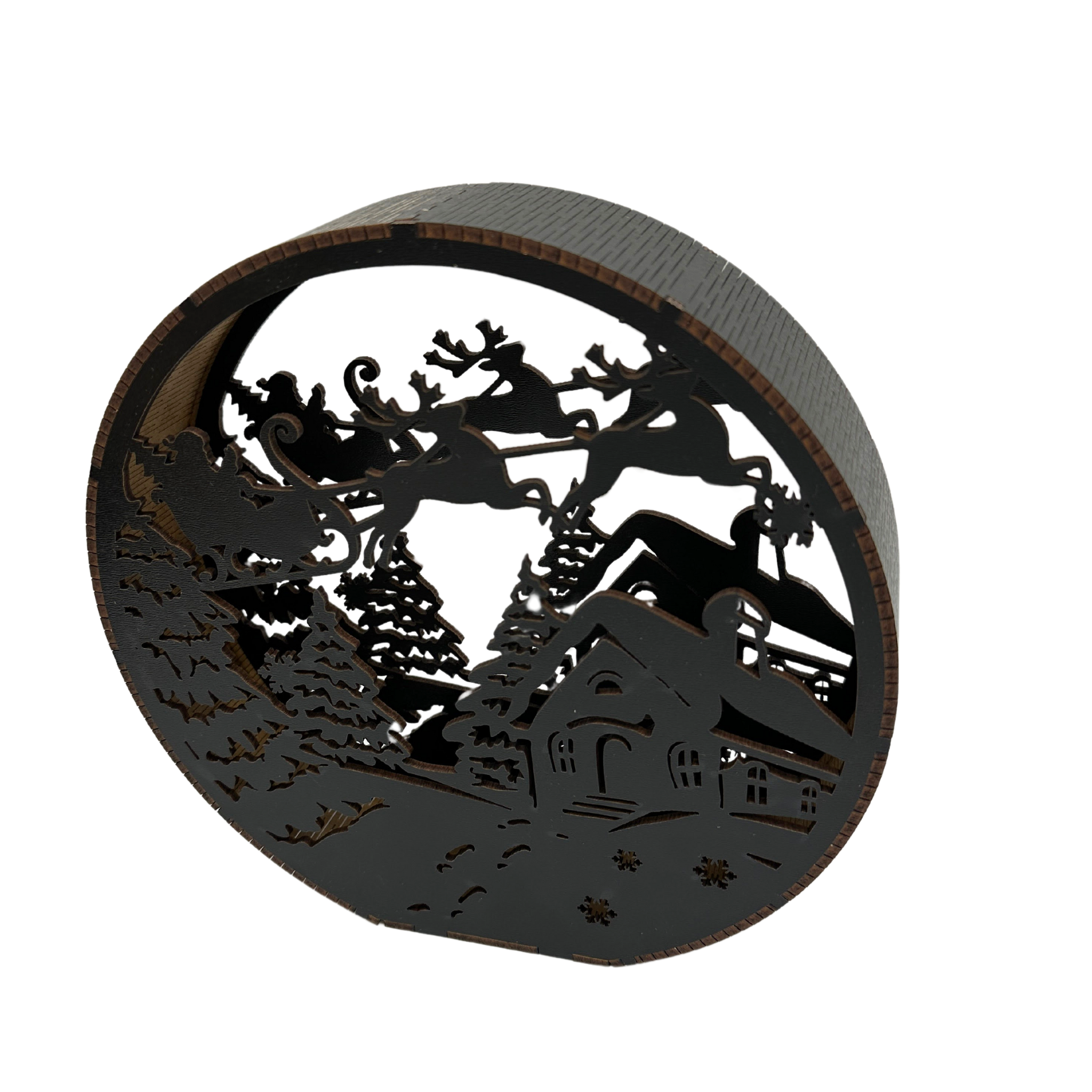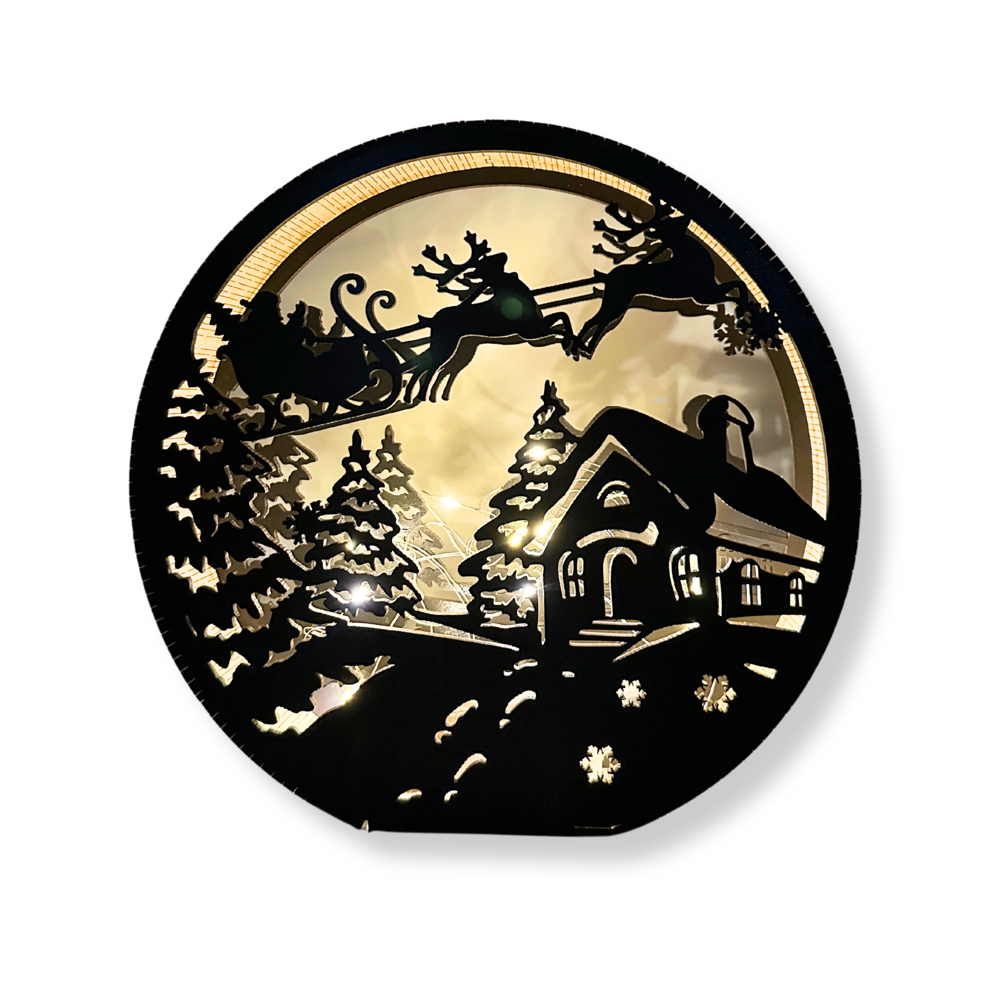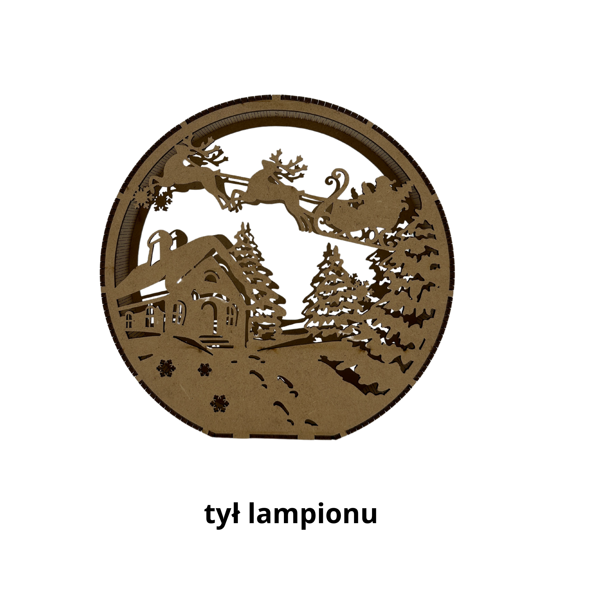 Lampion z wizerunkiem Świętego Mikołaja mknącego na saniach nad ośnieżonym domkiem. Jest to tradycyjny obrazek Świąt Bożego Narodzenia.